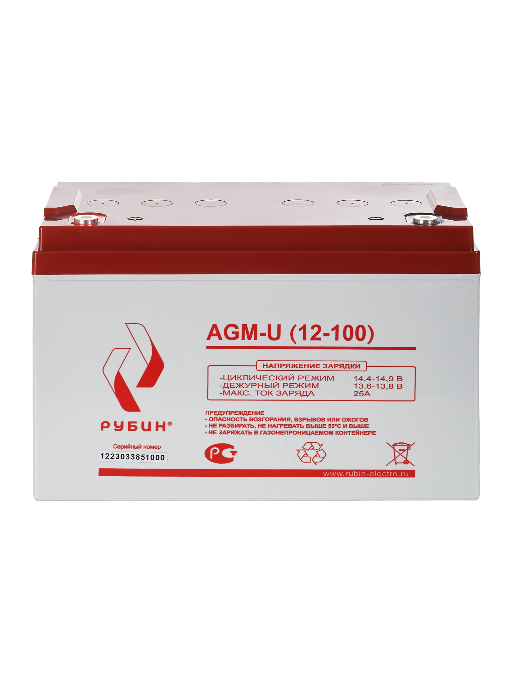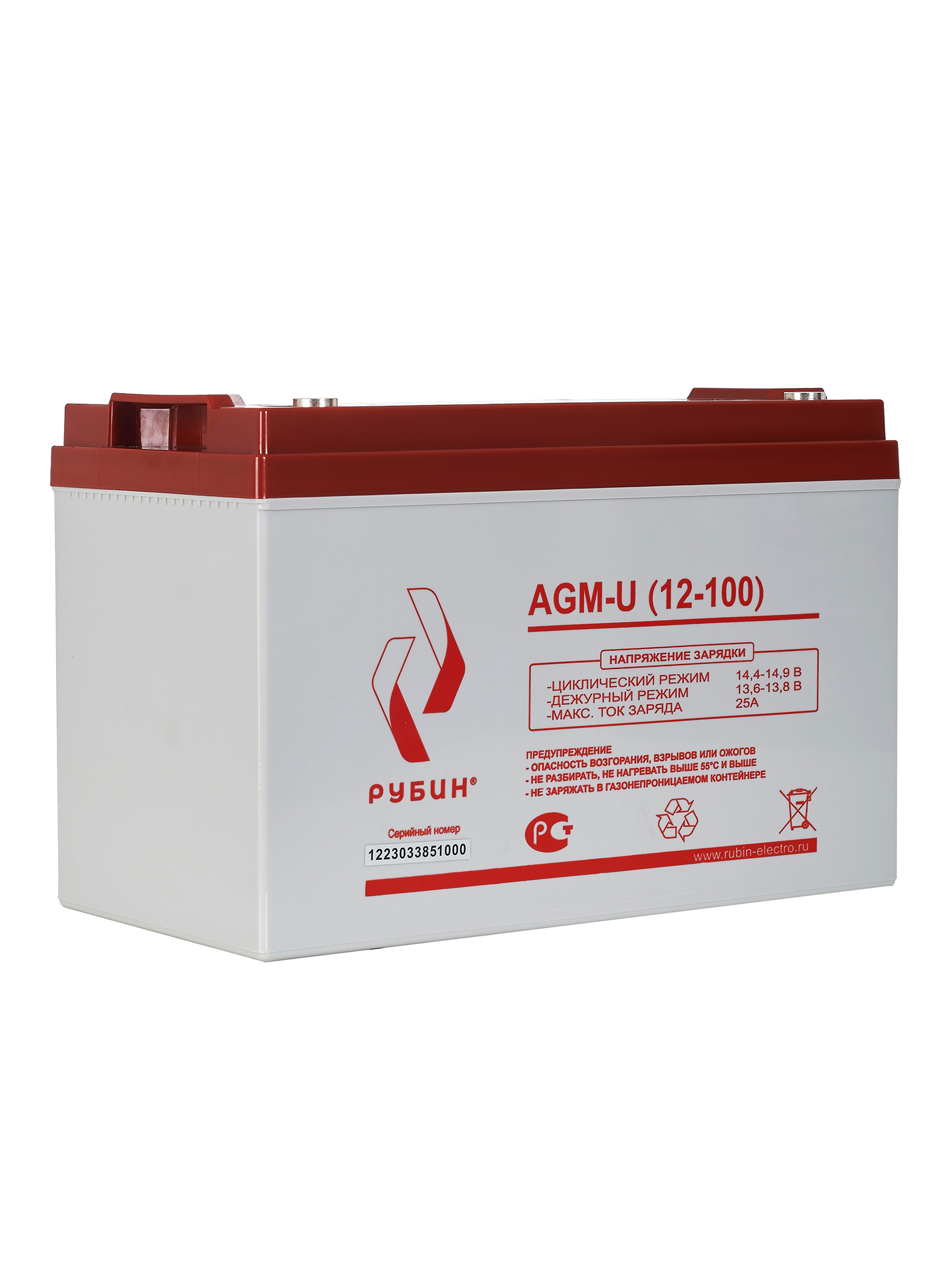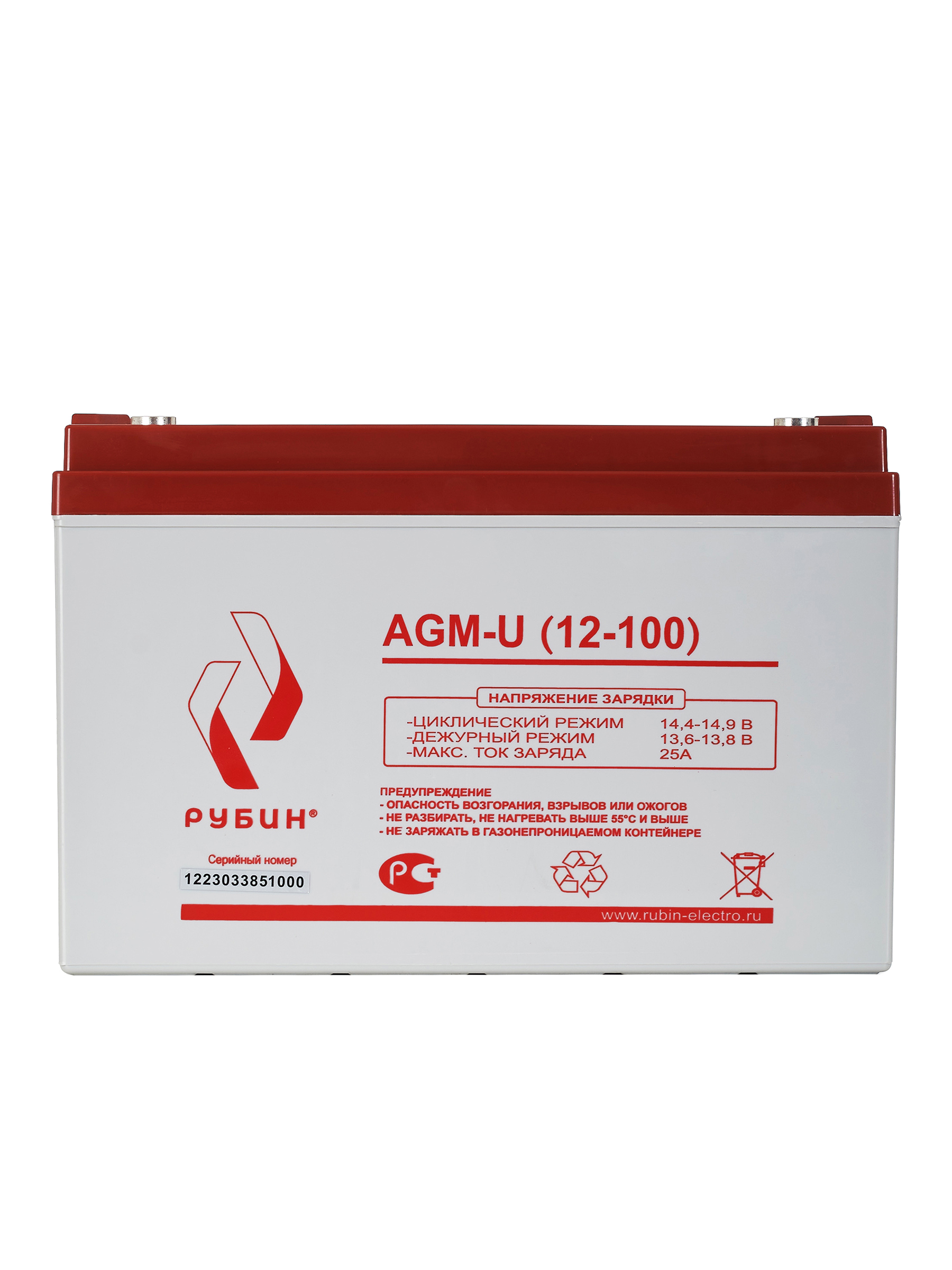 Аккумуляторная батарея Рубин 12V 100Ah AGM (30.5kg) арт РЭ-АКБ12100 Свинцово-кислотные аккумуляторы РУБИН созданы по технологии AGM, с абсорбированным электролитом. Аккумуляторы являются не обслуживаемыми, герметичными, а образующийся газ рекомбинируется. Корпус аккумуляторов РУБИН выполнен из высокопрочного ABS пластика, что вкупе с технологией AGM обеспечивает высокую устойчивость к возгоранию и взрывобезопасность. СФЕРЫ ПРИМЕНЕНИЯ: - Источники бесперебойного питания - Источники резервного энергоснабжения - Системы контроля и доступа - Системы тревожного оповещения - Переносные и портативные приборы - Различные области приборостроения Аккумуляторы обладают низким саморазрядом (до 3%). Рабочее напряжение 12 V. Оборудование присоединяется к аккумуляторам болтами М8, которые входят в комплект. Срок службы АКБ зависит от количества циклов, глубины разрядов, температурного режима, напряжения заряда и других факторов. Если АКБ не эксплуатируется, рекомендуем заряжать АКБ по крайней мере раз в полгода. Гарантийный срок эксплуатации изделия устанавливается в размере 12-ти календарных месяцев со дня продажи. Перед использованием АКБ РУБИН для оптимизации работоспособности рекомендуем провести четыре цикла разряда/заряда. Емкость 100 Ач Напряжение батареи 12 В Тип батареи AGM Максимальный ток заряда 25 А Максимальный ток разряда (5сек) 800 А Тип клемм М8х20 Диапазон зарядного напряжения в циклическом режиме от 14,4 В до 14,7 В при 25⁰С Диапазон зарядного напряжения в буферном режиме от 13,5 до 13,8В при 25⁰С Саморазряд при 25°С, от емкости АКБ (в месяц) 3% Расчетный срок службы в буферном режиме (20°С) 10 лет Материал корпуса ABS пластик Рабочий диапазон температур от -10°С до +50°С Вес 30,5 кг Габариты (ДхШхВ) 329х172х219 мм Габариты в коробке (ДхШхВ) 345х180х280 Штрихкод EAN-13 4673729657198 Комплектация АКБ, болты М8 2 шт, гарантийный талон, упаковка