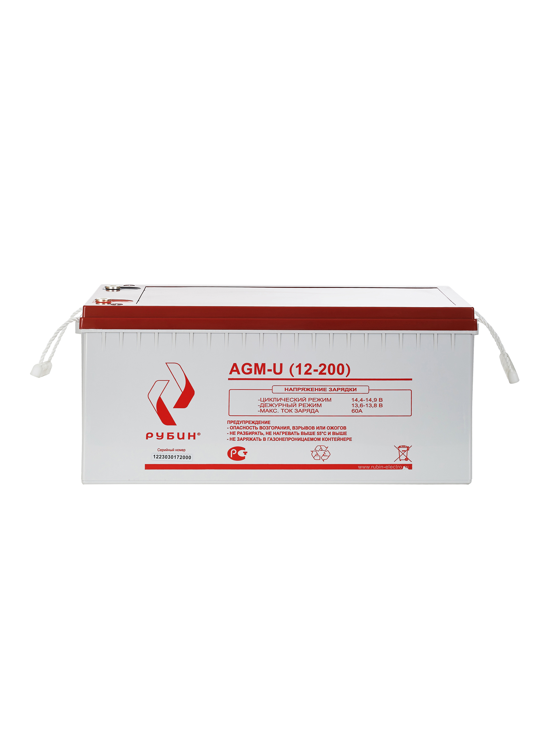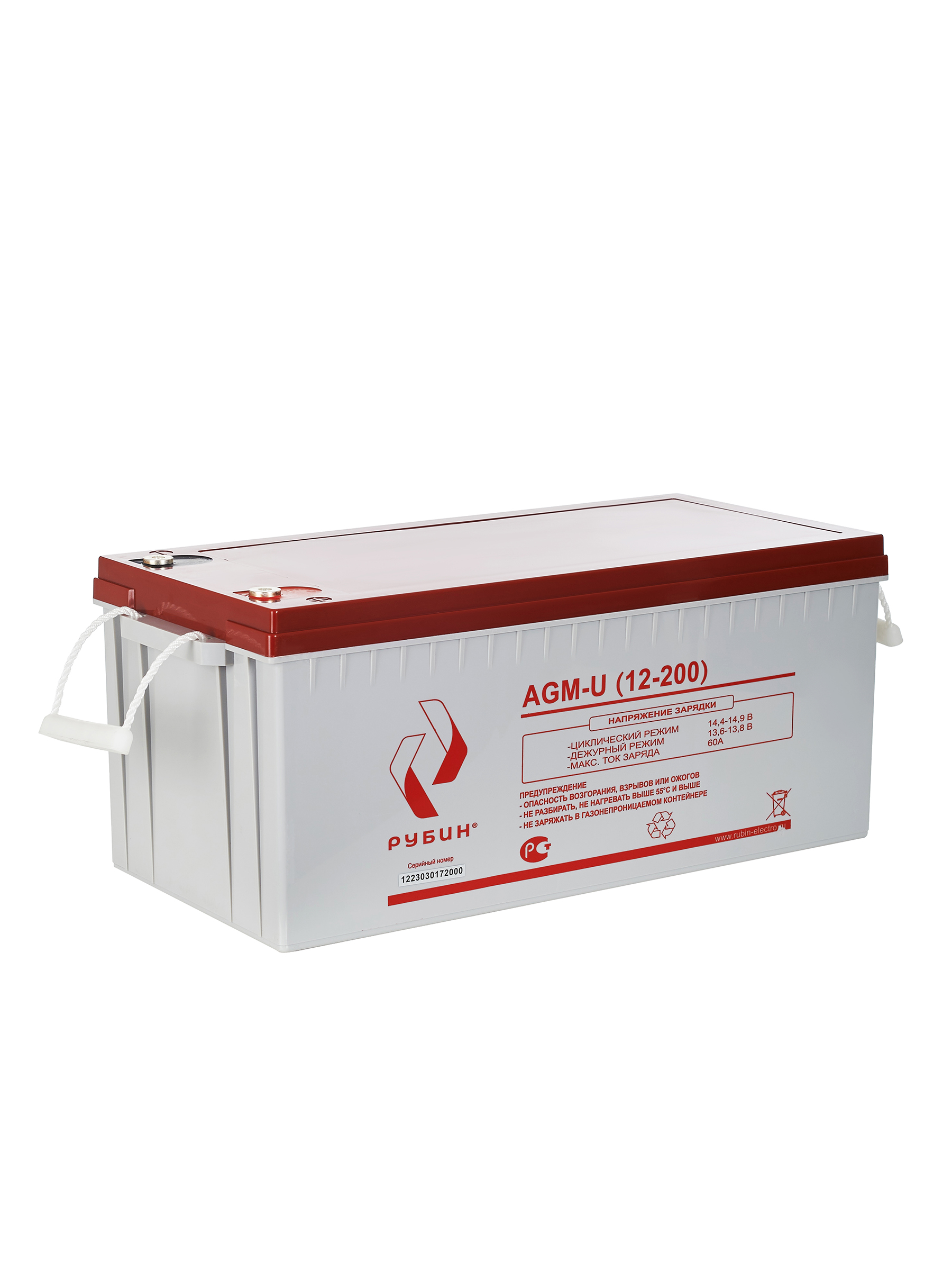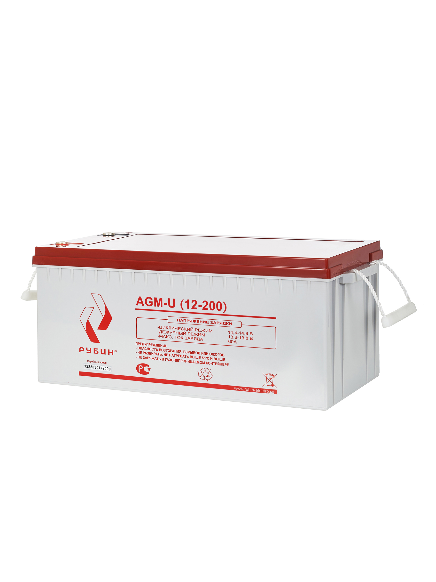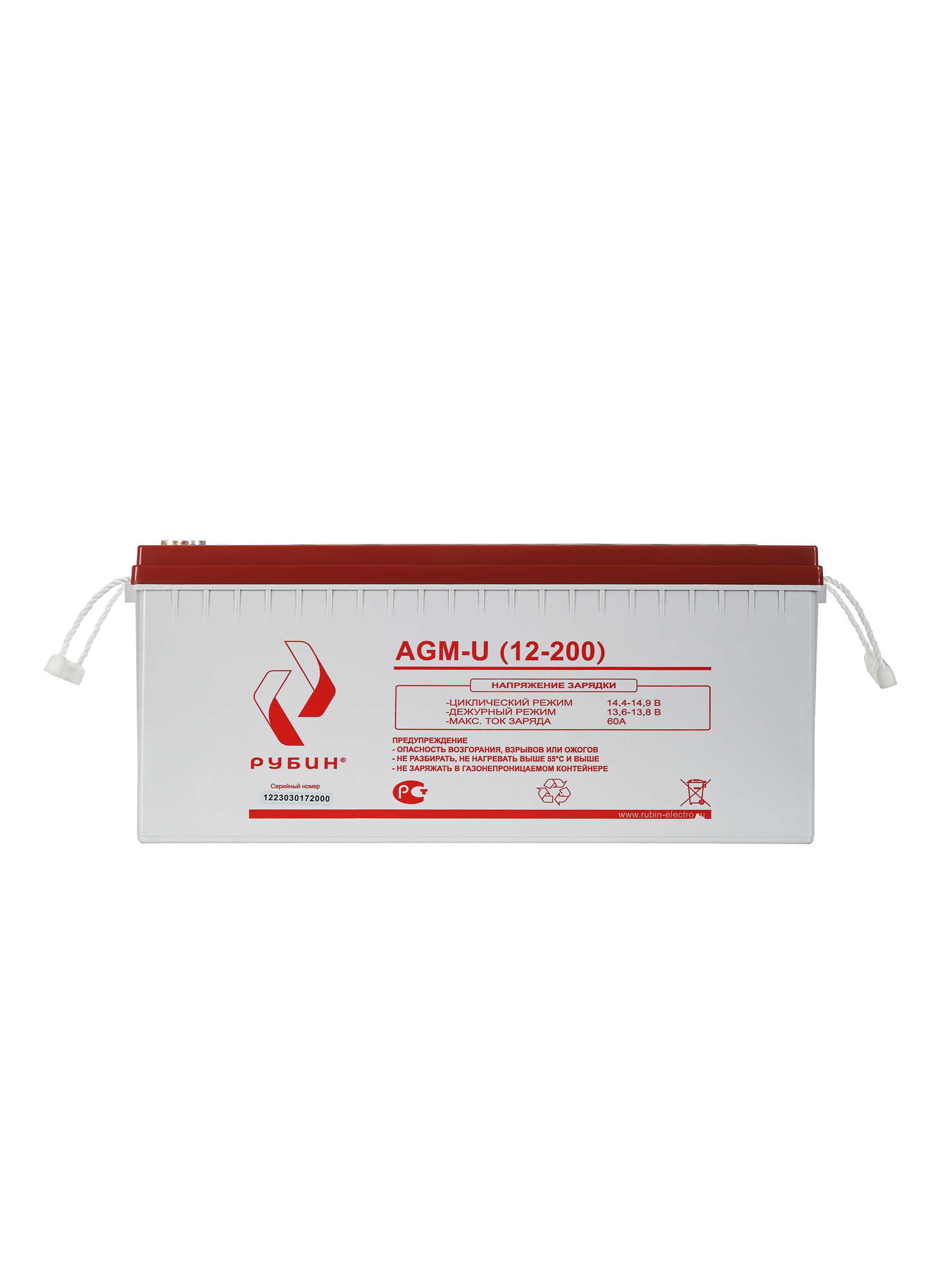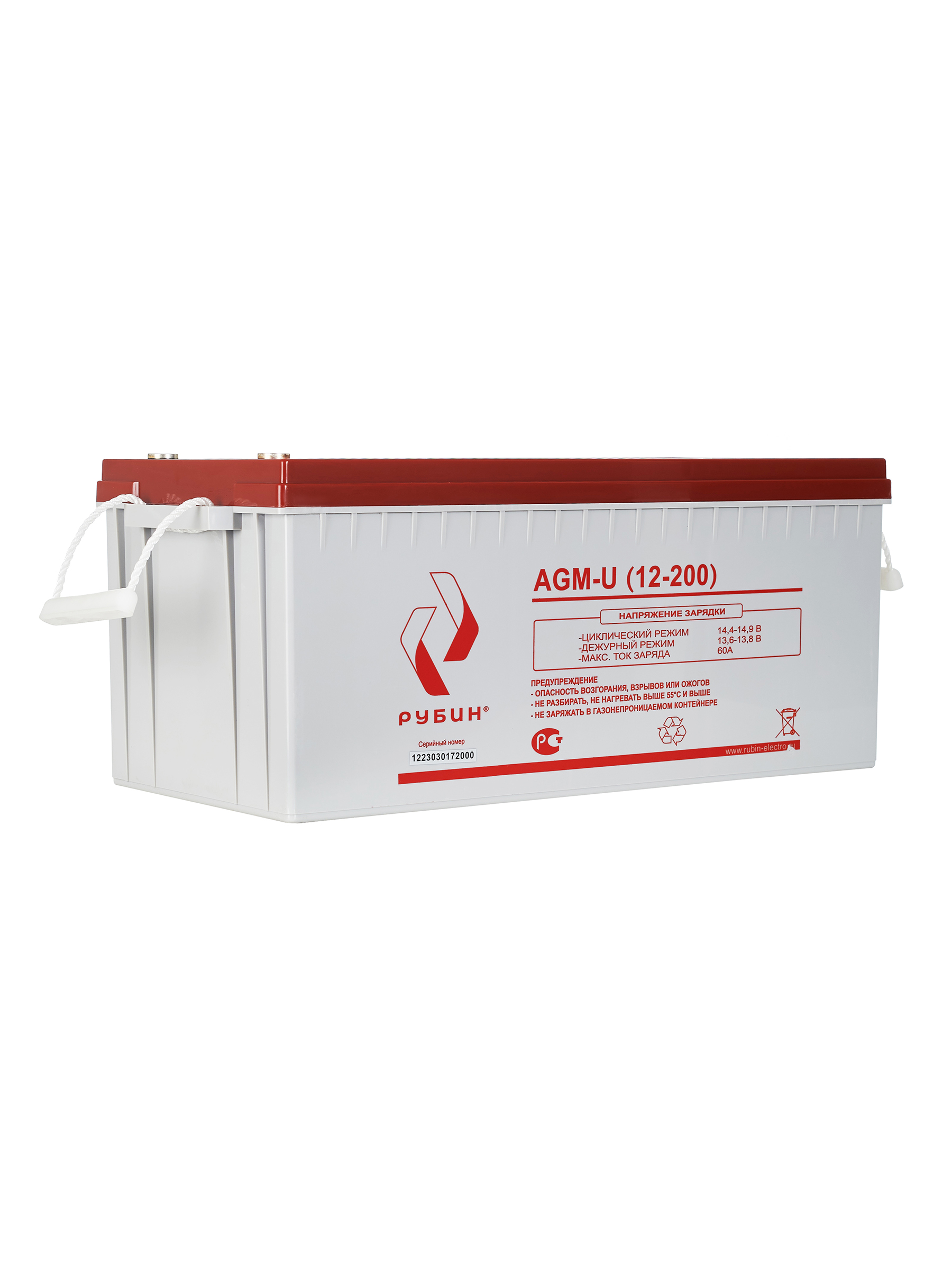 Аккумуляторная батарея Рубин 12V 200Ah AGM (60kg) арт. РЭ-АКБ12200 Свинцово-кислотные аккумуляторы РУБИН созданы по технологии AGM, с абсорбированным электролитом. Аккумуляторы являются не обслуживаемыми, герметичными, а образующийся газ рекомбинируется. Корпус аккумуляторов РУБИН выполнен из высокопрочного ABS пластика, что вкупе с технологией AGM обеспечивает высокую устойчивость к возгоранию и взрывобезопасность. СФЕРЫ ПРИМЕНЕНИЯ: - Источники бесперебойного питания - Источники резервного энергоснабжения - Системы контроля и доступа - Системы тревожного оповещения - Переносные и портативные приборы - Различные области приборостроения Аккумуляторы обладают низким саморазрядом (до 3%). Рабочее напряжение 12 V. Оборудование присоединяется к аккумуляторам болтами М8, которые входят в комплект. Срок службы АКБ зависит от количества циклов, глубины разрядов, температурного режима, напряжения заряда и других факторов. Если АКБ не эксплуатируется, рекомендуем заряжать АКБ по крайней мере раз в полгода. Гарантийный срок эксплуатации изделия устанавливается в размере 12-ти календарных месяцев со дня продажи. Перед использованием АКБ РУБИН для оптимизации работоспособности рекомендуем провести четыре цикла разряда/заряда. Емкость, Ач 200Ач Напряжение батареи 12 В Тип батареи AGM Максимальный ток заряда 60 А Максимальный ток разряда (5сек) 1400 А Тип клемм М8х20 Диапазон зарядного напряжения в циклическом режиме от 14,4В до 14,7В при 25⁰С Диапазон зарядного напряжения в буферном режиме от 13,5 до 13,8В при 25⁰С Саморазряд при 25°С, от емкости АКБ (в месяц) 3% Расчетный срок службы в буферном режиме (20°С) 10 лет Материал корпуса ABS пластик Рабочий диапазон температур от -10°С до +50°С Вес 60 кг Габариты (ДхШхВ) 522х239х218 мм Габариты в коробке (ДхШхВ) 530х248х285 Штрихкод EAN-13 4673729657204 Комплектация АКБ, болты М8 2 шт, гарантийный талон, упаковка