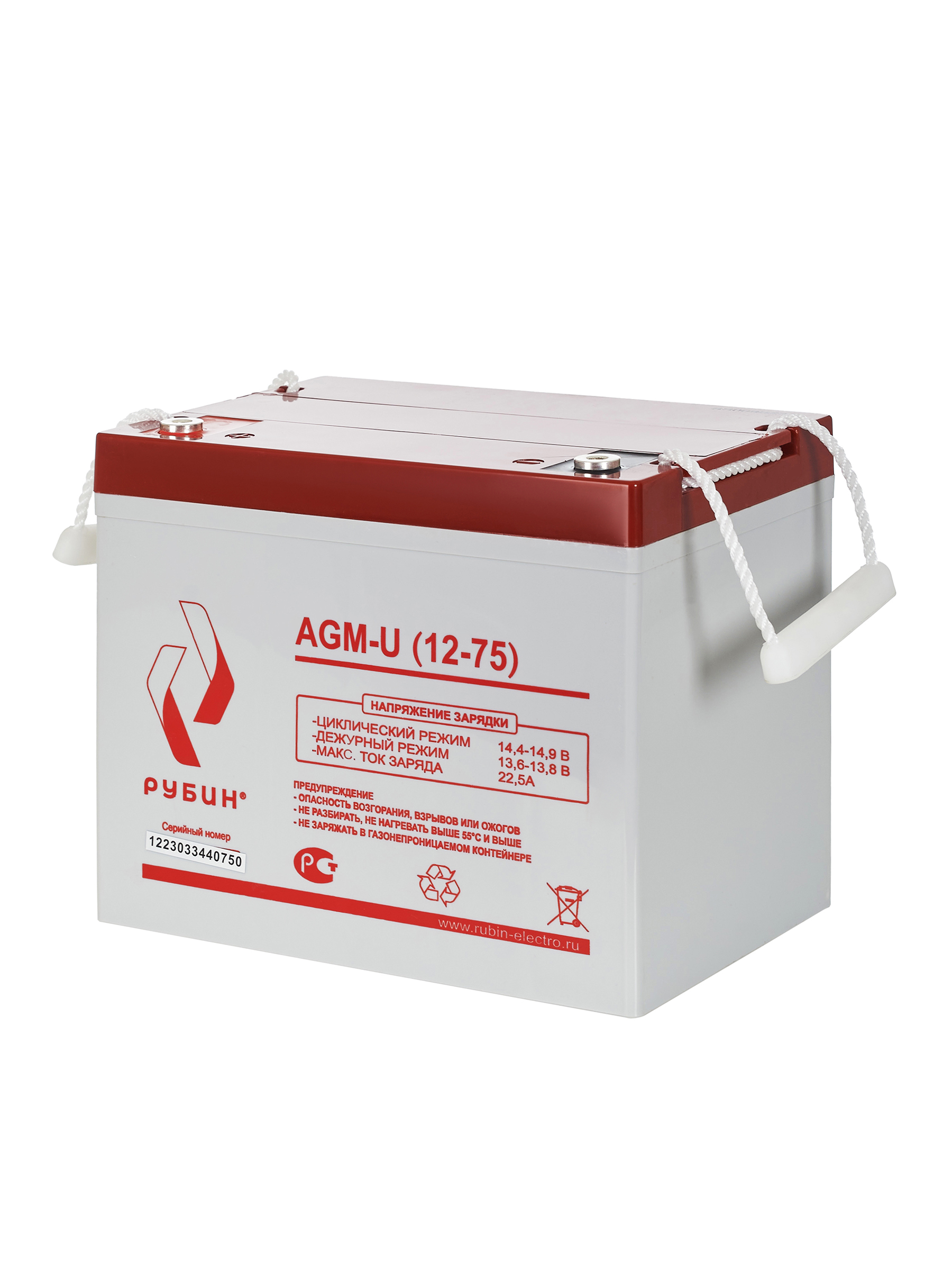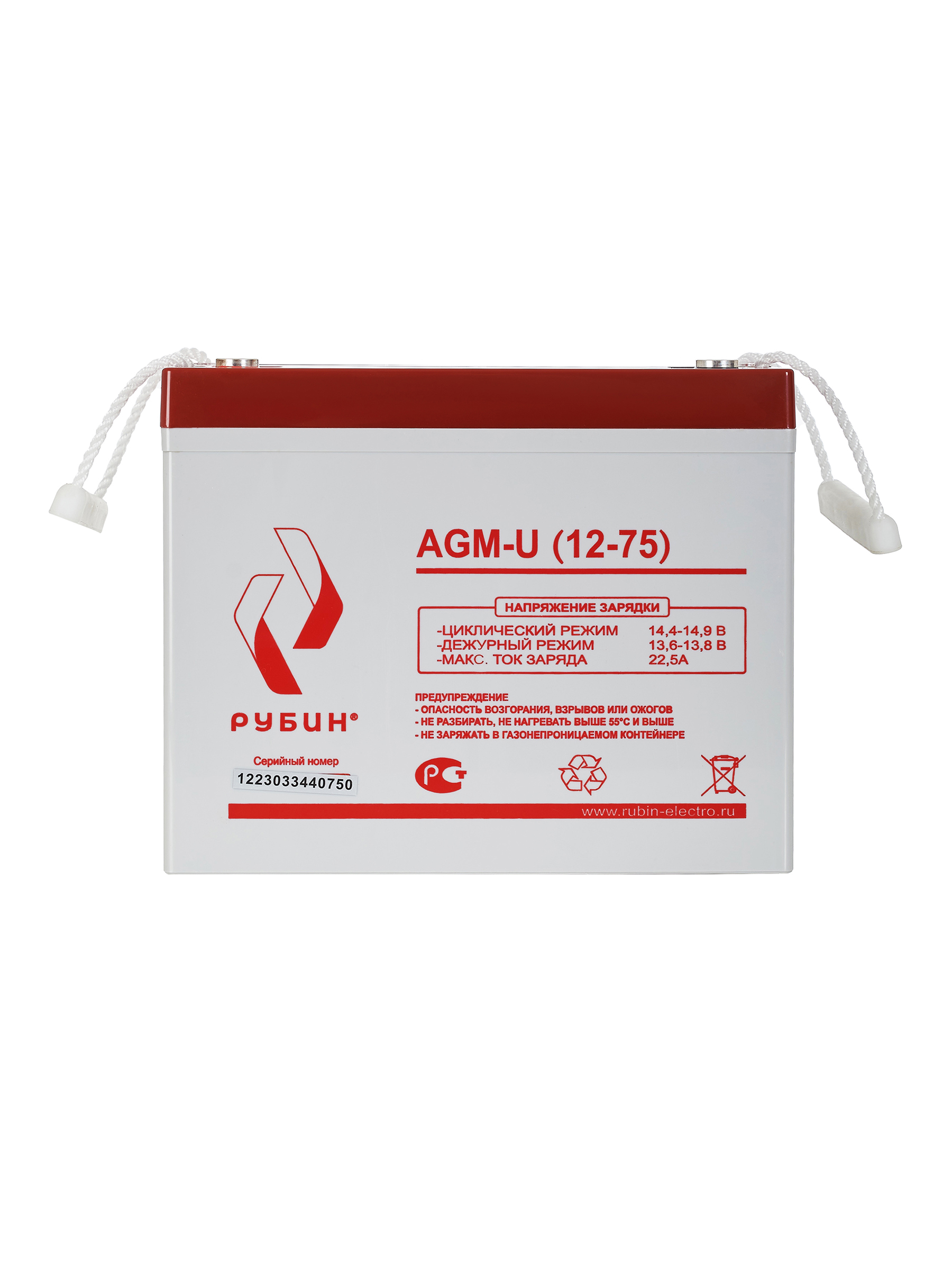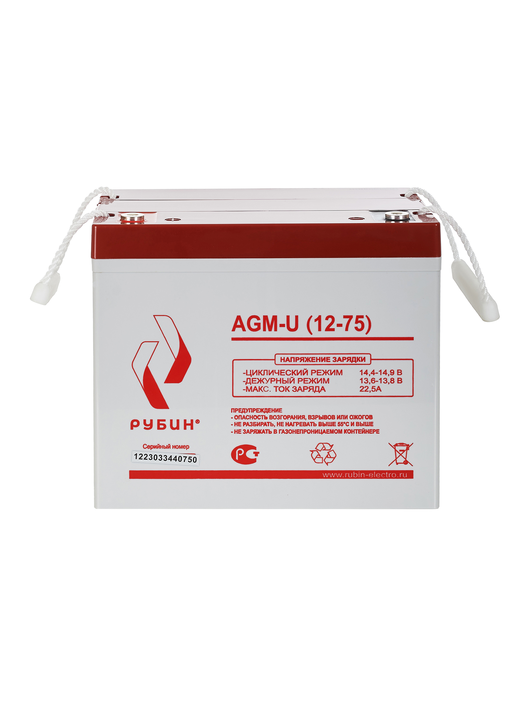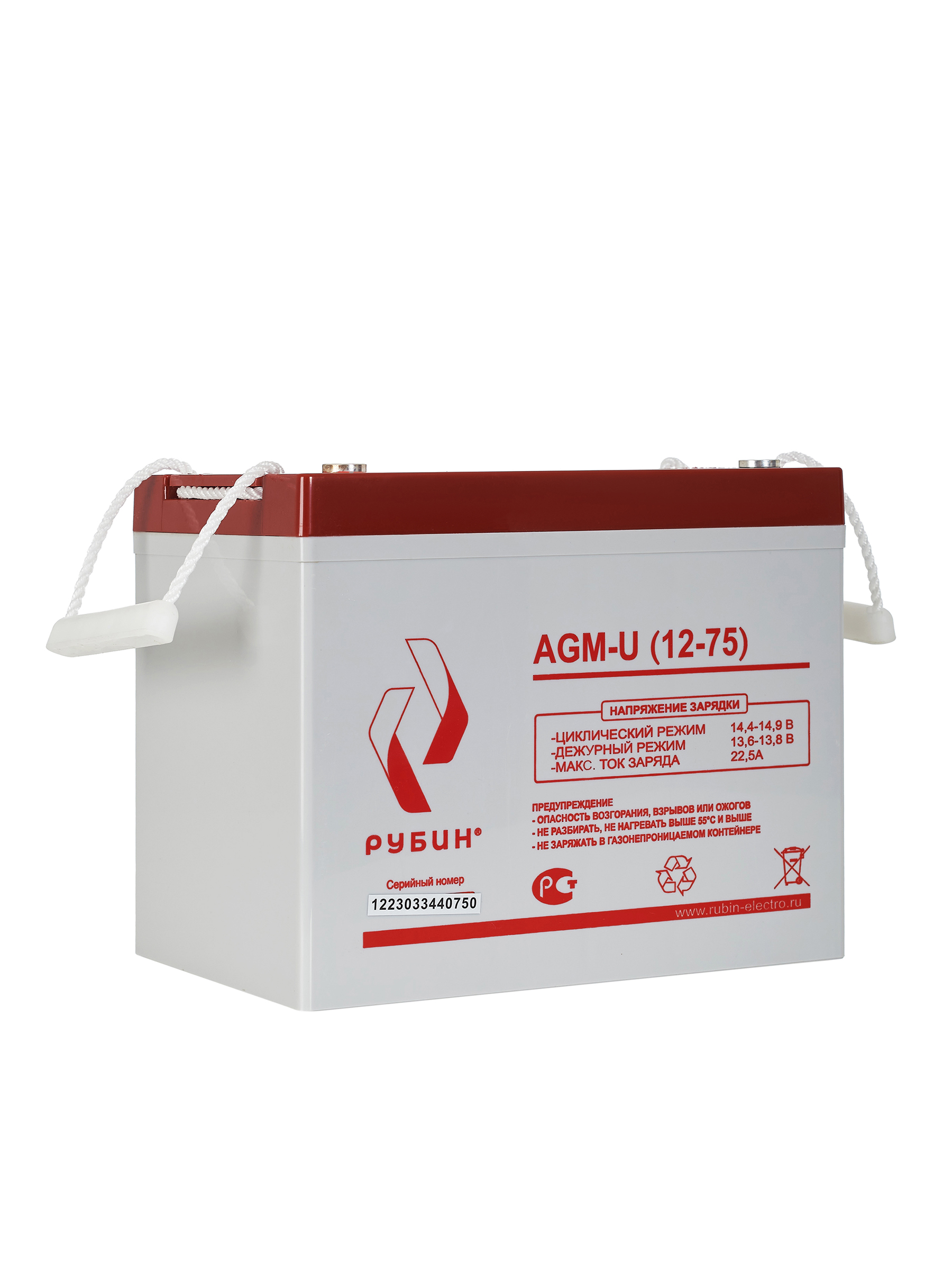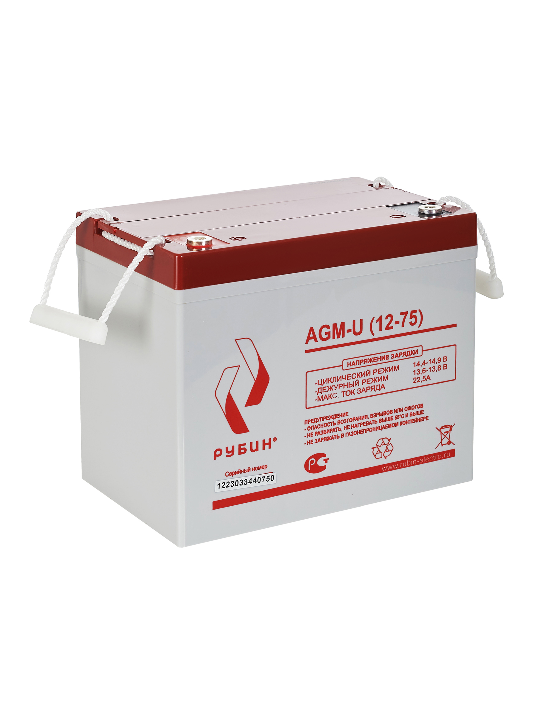 Аккумуляторная батарея Рубин 12V 75Ah AGM (22.5kg) арт РЭ-АКБ1275 Свинцово-кислотные аккумуляторы РУБИН созданы по технологии AGM, с абсорбированным электролитом. Аккумуляторы являются не обслуживаемыми, герметичными, а образующийся газ рекомбинируется. Корпус аккумуляторов РУБИН выполнен из высокопрочного ABS пластика, что вкупе с технологией AGM обеспечивает высокую устойчивость к возгоранию и взрывобезопасность. СФЕРЫ ПРИМЕНЕНИЯ: - Источники бесперебойного питания - Источники резервного энергоснабжения - Системы контроля и доступа - Системы тревожного оповещения - Переносные и портативные приборы - Различные области приборостроения Аккумуляторы обладают низким саморазрядом (до 3%). Рабочее напряжение 12 V. Оборудование присоединяется к аккумуляторам болтами М6, которые входят в комплект. Срок службы АКБ зависит от количества циклов, глубины разрядов, температурного режима, напряжения заряда и других факторов. Если АКБ не эксплуатируется, рекомендуем заряжать АКБ по крайней мере раз в полгода. Гарантийный срок эксплуатации изделия устанавливается в размере 12-ти календарных месяцев со дня продажи. Перед использованием АКБ РУБИН для оптимизации работоспособности рекомендуем провести четыре цикла разряда/заряда. Емкость 75 Ач Напряжение батареи 12В Тип батареи AGM Максимальный ток заряда 22,5 А Максимальный ток разряда (5сек) 700А Тип клемм М6х16 Диапазон зарядного напряжения в циклическом режиме от 14,5В до 14,7В при 25⁰С Диапазон зарядного напряжения в буферном режиме от 13,5В до 13,8В при 25⁰С Саморазряд при 25°С, от емкости АКБ (в месяц) 3% Расчетный срок службы в буферном режиме (20°С) 10 лет Материал корпуса ABS пластик Рабочий диапазон температур от -10°С до +50°С Вес 22,5 кг Габариты (ДхШхВ) 260х168х215 мм Габариты в коробке (ДхШхВ) 273х178х263 Штрихкод EAN-13 4673729657181 Комплектация АКБ, болты М6 2 шт, гарантийный талон, упаковка