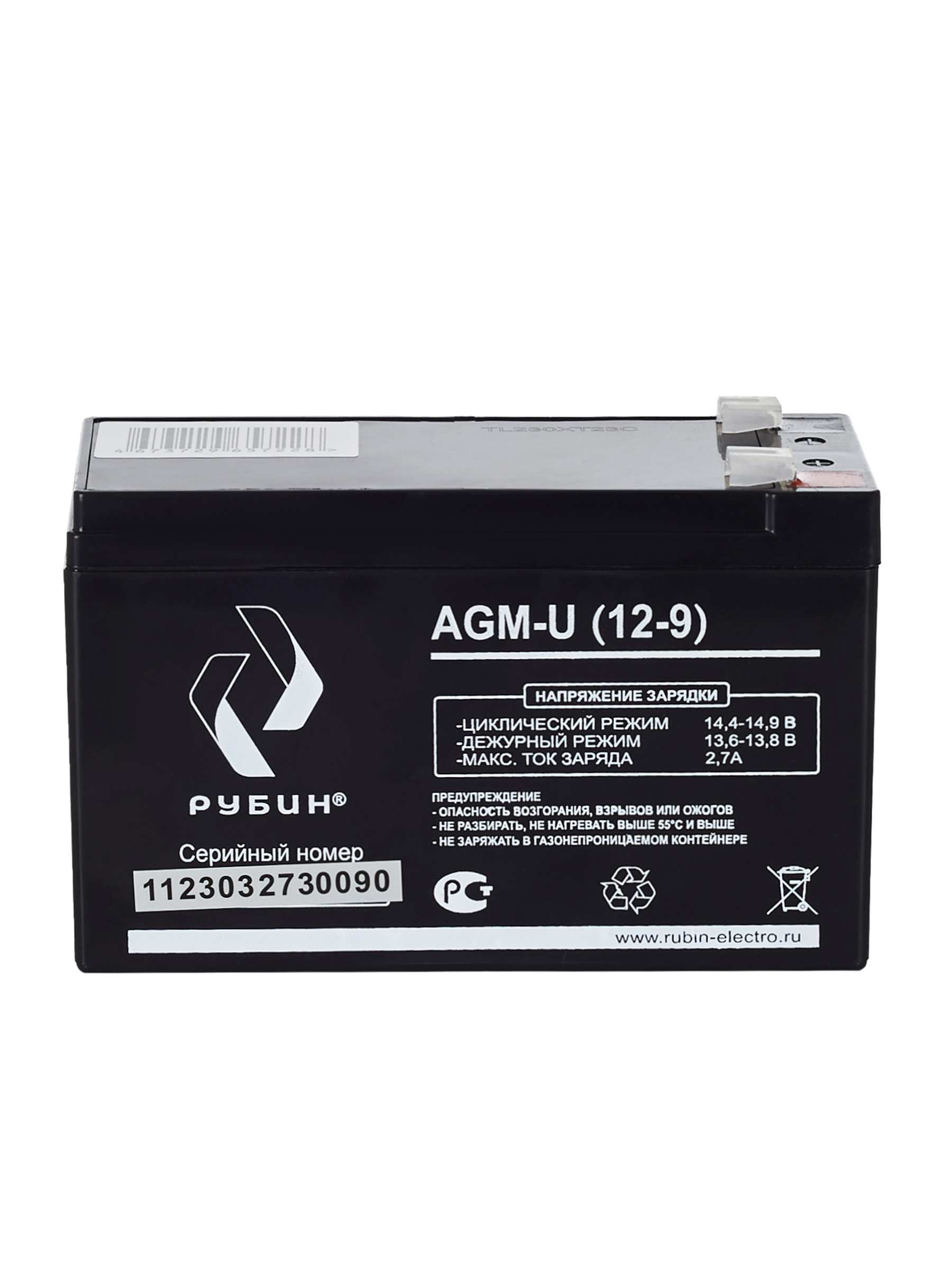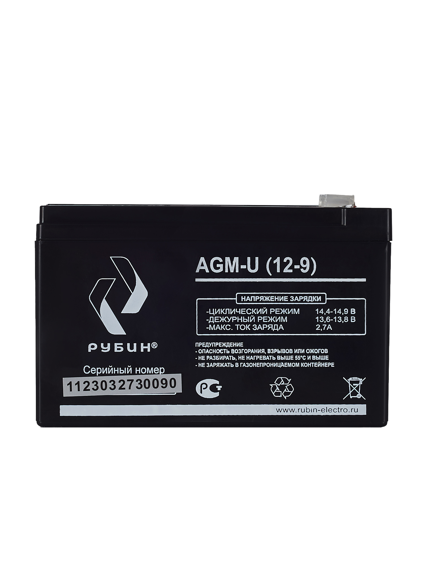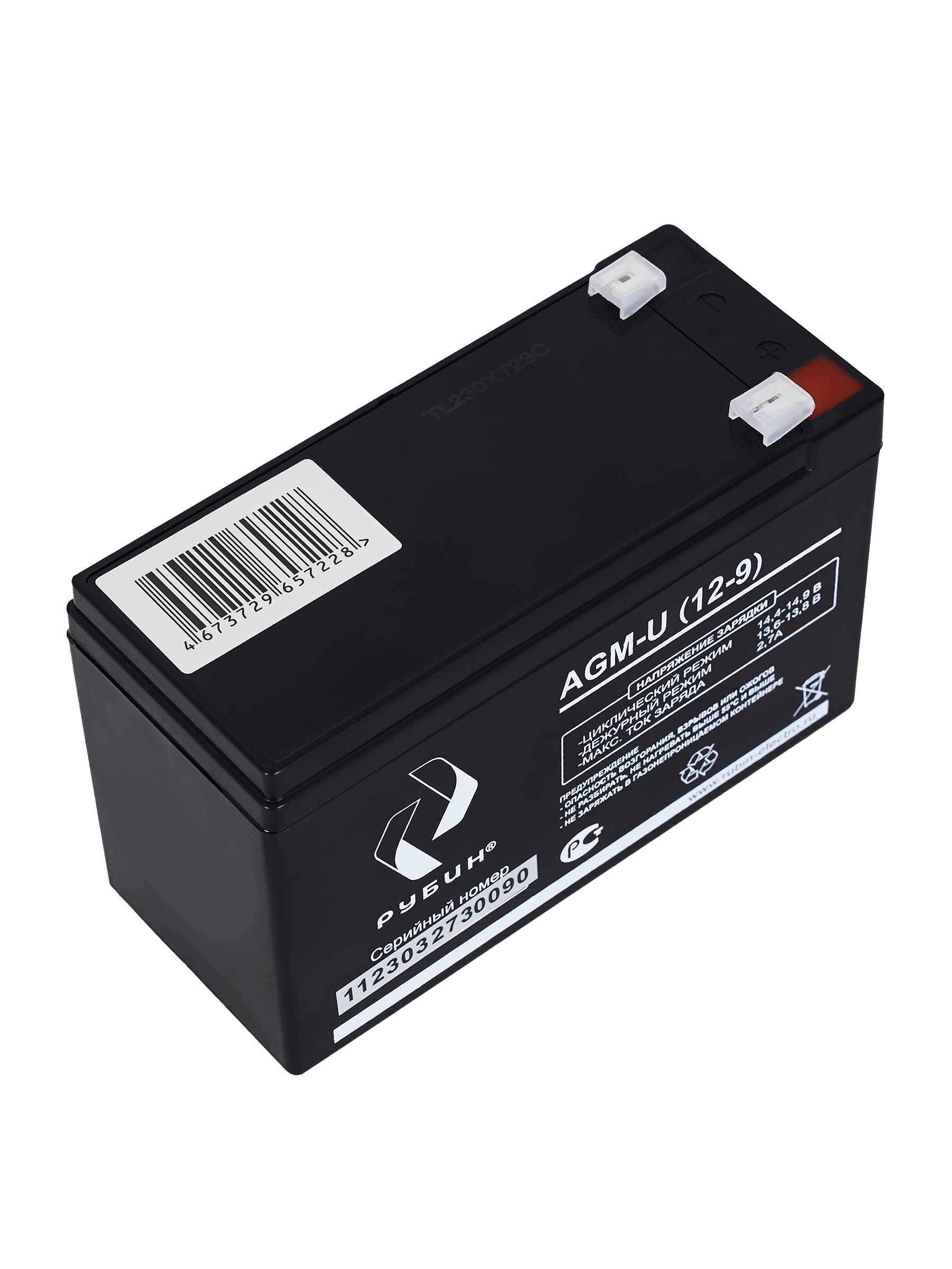 Аккумуляторная батарея Рубин 12V 9Ah AGM (2.3kg) Батарея для источника бесперебойного питания (АКБ для ИБП и инверторов) Свинцово-кислотные аккумуляторы РУБИН созданы по технологии AGM, с абсорбированным электролитом. Аккумуляторы являются не обслуживаемыми, герметичными, а образующийся газ рекомбинируется. Корпус аккумуляторов РУБИН выполнен из высокопрочного ABS пластика, что вкупе с технологией AGM обеспечивает высокую устойчивость к возгоранию и взрывобезопасность. СФЕРЫ ПРИМЕНЕНИЯ: - Источники бесперебойного питания - Источники резервного энергоснабжения - Системы контроля и доступа - Аварийные и световые системы тревожного оповещения - Системы безопасности - Пожарные системы - Переносные и портативные приборы - Различные области приборостроения - Накопители солнечной и ветровой энергии Аккумуляторы обладают низким саморазрядом (до 2%). Рабочее напряжение 12 V. Оборудование присоединяется к аккумуляторам с клеммами F2. Срок службы АКБ зависит от количества циклов, глубины разрядов, температурного режима, напряжения заряда и других факторов. Если АКБ не эксплуатируется, рекомендуем заряжать АКБ по крайней мере раз в полгода. Эта мера нужна для «тренировки аккумуляторных пластин чтобы не было окисления» Гарантийный срок эксплуатации изделия устанавливается в размере 12-ти календарных месяцев со дня продажи. Перед использованием АКБ РУБИН для оптимизации работоспособности рекомендуем провести четыре цикла разряда/заряда. Аккумуляторная батарея Рубин 12V 9Ah AGM отвечает всем международным стандартам безопасности! Так же зарядное устройство может использоваться как : аккумулятор для детского электромобиля, аккумулятор для детского мотоцикла, аккумулятор для детского квадроцикла, аккумулятор для медицинского оборудования, аккумулятор для пожарной сигнализации, аккумулятор для аварийного освещения, аккумулятор для котла.