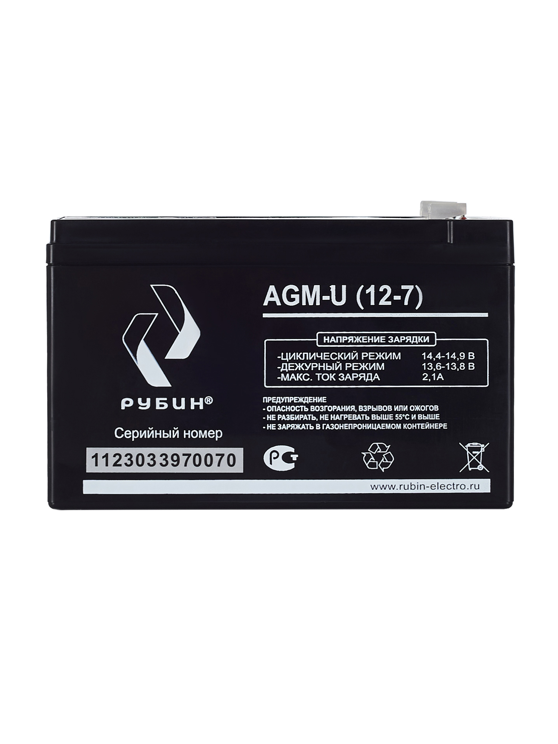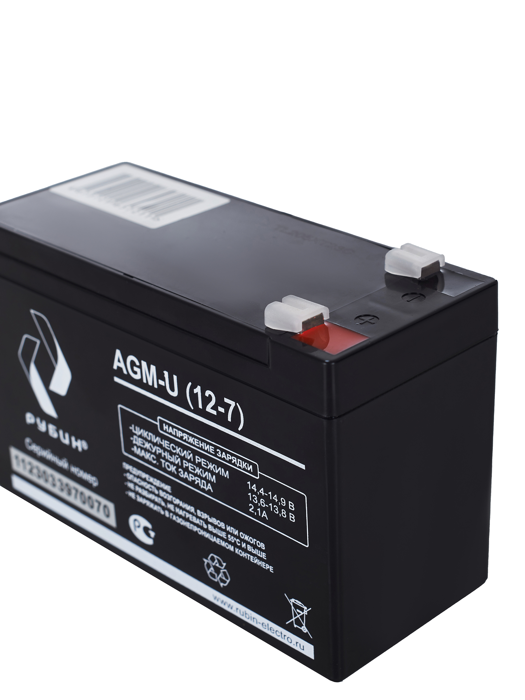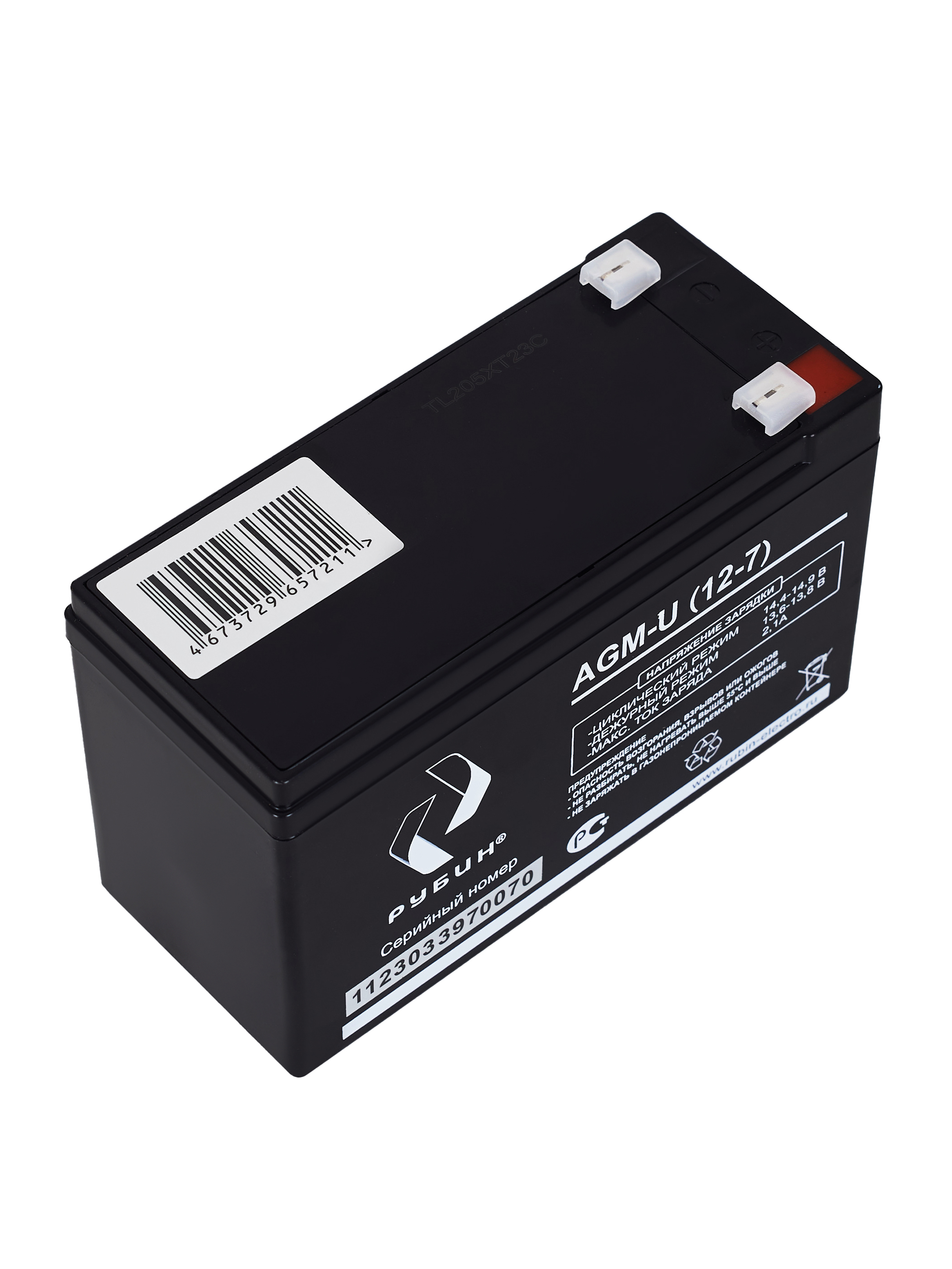 Аккумуляторная батарея Рубин 12V 7Ah AGM (2.05kg) Батарея для источника бесперебойного питания (АКБ для ИБП и инверторов) Свинцово-кислотные аккумуляторы РУБИН созданы по технологии AGM, с абсорбированным электролитом. Аккумуляторы являются не обслуживаемыми, герметичными, а образующийся газ рекомбинируется. Корпус аккумуляторов РУБИН выполнен из высокопрочного ABS пластика, что вкупе с технологией AGM обеспечивает высокую устойчивость к возгоранию и взрывобезопасность. СФЕРЫ ПРИМЕНЕНИЯ: - Источники бесперебойного питания - Источники резервного энергоснабжения - Системы контроля и доступа - Аварийные и световые системы тревожного оповещения - Системы безопасности - Пожарные системы - Переносные и портативные приборы - Различные области приборостроения - Накопители солнечной и ветровой энергии Аккумуляторы обладают низким саморазрядом (до 2%). Рабочее напряжение 12 V. Оборудование присоединяется к аккумуляторам с клеммами F2. Срок службы АКБ зависит от количества циклов, глубины разрядов, температурного режима, напряжения заряда и других факторов. Если АКБ не эксплуатируется, рекомендуем заряжать АКБ по крайней мере раз в полгода. Эта мера нужна для «тренировки аккумуляторных пластин чтобы не было окисления» Гарантийный срок эксплуатации изделия устанавливается в размере 12-ти календарных месяцев со дня продажи. Перед использованием АКБ РУБИН для оптимизации работоспособности рекомендуем провести четыре цикла разряда/заряда. Аккумуляторная батарея Рубин 12V 7Ah AGM отвечает всем международным стандартам безопасности! Так же зарядное устройство может использоваться как : аккумулятор для детского электромобиля, аккумулятор для детского мотоцикла, аккумулятор для детского квадроцикла, аккумулятор для медицинского оборудования, аккумулятор для пожарной сигнализации, аккумулятор для аварийного освещения, аккумулятор для котла.