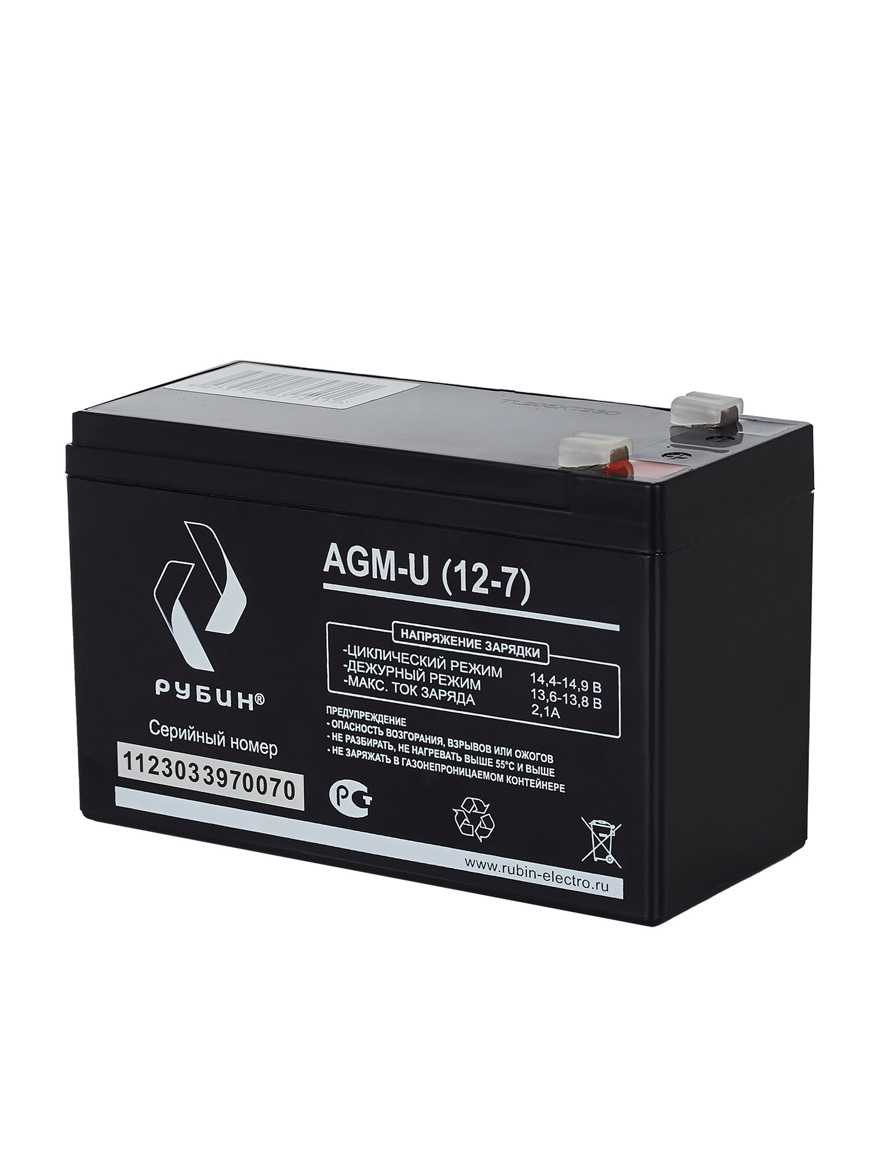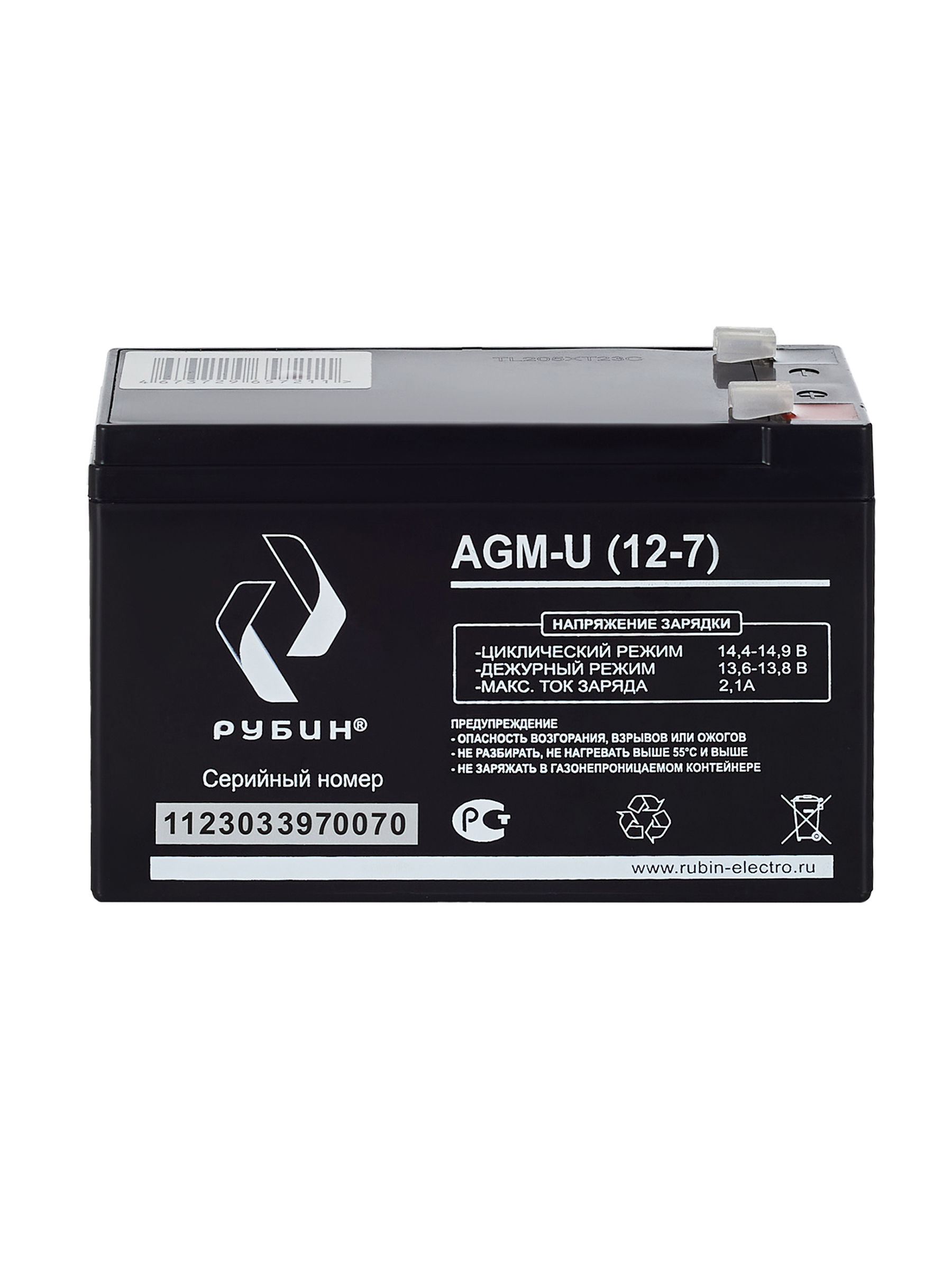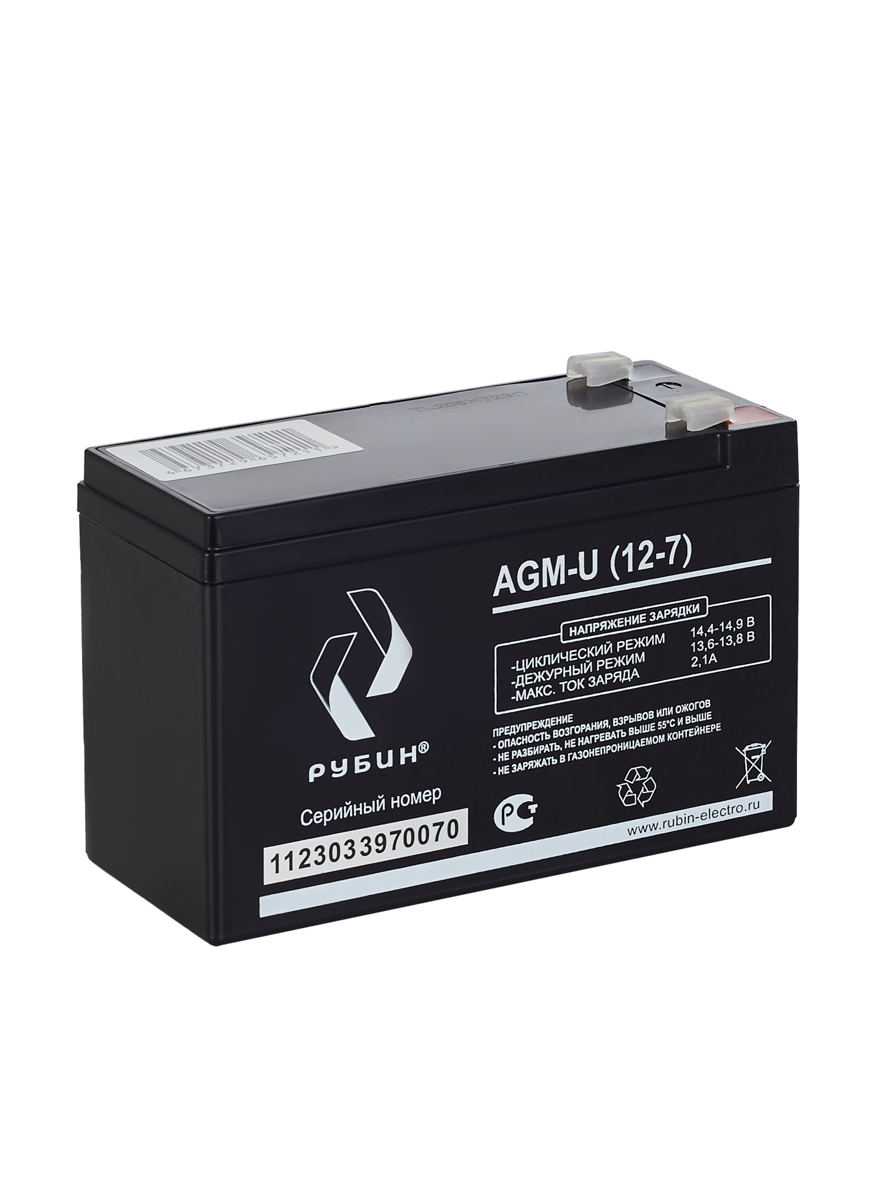 Аккумуляторная батарея Рубин 12V 7Ah AGM (2.05kg) Батарея для источника бесперебойного питания (АКБ для ИБП и инверторов) Свинцово-кислотные аккумуляторы РУБИН созданы по технологии AGM, с абсорбированным электролитом. Аккумуляторы являются не обслуживаемыми, герметичными, а образующийся газ рекомбинируется. Корпус аккумуляторов РУБИН выполнен из высокопрочного ABS пластика, что вкупе с технологией AGM обеспечивает высокую устойчивость к возгоранию и взрывобезопасность. СФЕРЫ ПРИМЕНЕНИЯ: - Источники бесперебойного питания - Источники резервного энергоснабжения - Системы контроля и доступа - Аварийные и световые системы тревожного оповещения - Системы безопасности - Пожарные системы - Переносные и портативные приборы - Различные области приборостроения - Накопители солнечной и ветровой энергии Аккумуляторы обладают низким саморазрядом (до 2%). Рабочее напряжение 12 V. Оборудование присоединяется к аккумуляторам с клеммами F2. Срок службы АКБ зависит от количества циклов, глубины разрядов, температурного режима, напряжения заряда и других факторов. Если АКБ не эксплуатируется, рекомендуем заряжать АКБ по крайней мере раз в полгода. Эта мера нужна для «тренировки аккумуляторных пластин чтобы не было окисления» Гарантийный срок эксплуатации изделия устанавливается в размере 12-ти календарных месяцев со дня продажи. Перед использованием АКБ РУБИН для оптимизации работоспособности рекомендуем провести четыре цикла разряда/заряда. Аккумуляторная батарея Рубин 12V 7Ah AGM отвечает всем международным стандартам безопасности! Так же зарядное устройство может использоваться как : аккумулятор для детского электромобиля, аккумулятор для детского мотоцикла, аккумулятор для детского квадроцикла, аккумулятор для медицинского оборудования, аккумулятор для пожарной сигнализации, аккумулятор для аварийного освещения, аккумулятор для котла.
